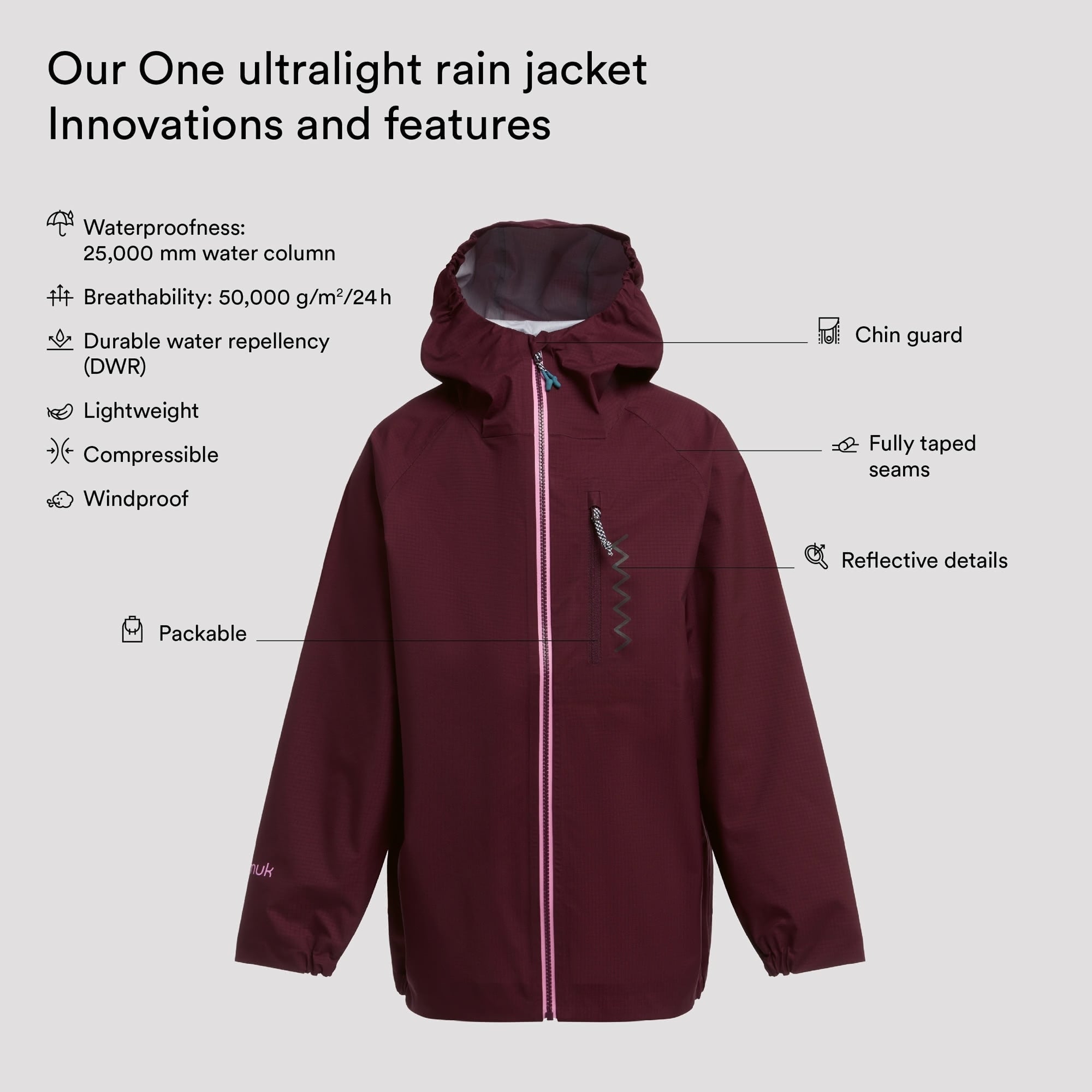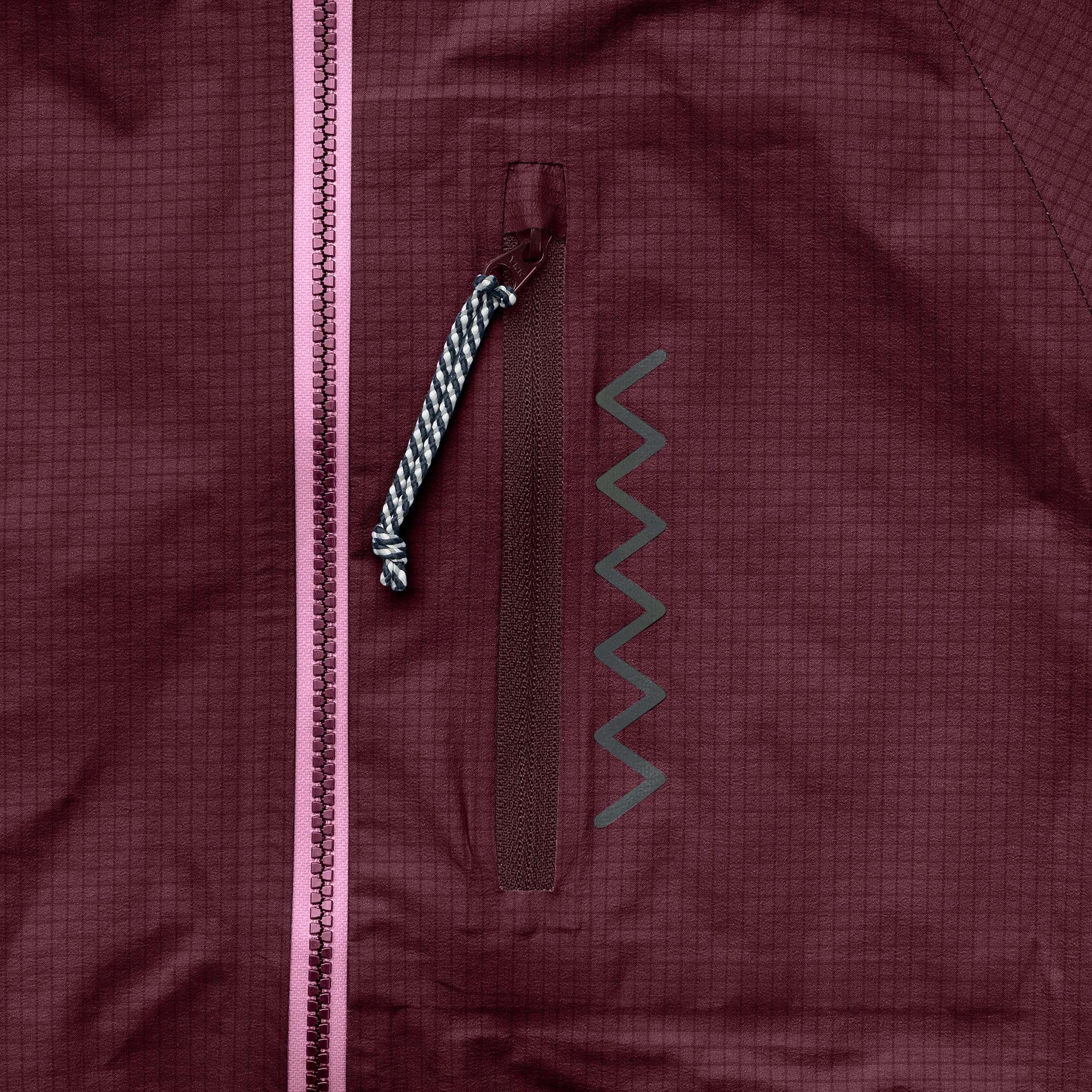 It combines maximum waterproof ratings with minimum weight. The water column of 25'000 mm, in combination with a very high breathability of 50'000 gr/m2/24, ensures that sweat can escape during hours of running around in the rain, but the jacket still keeps moisture on the outside, so the inside always stays nice and dry. At 150 grams (size 128/134), the jacket weighs slightly more than a Swiss chocolate bar and can be easily stowed away in its own inner pocket.