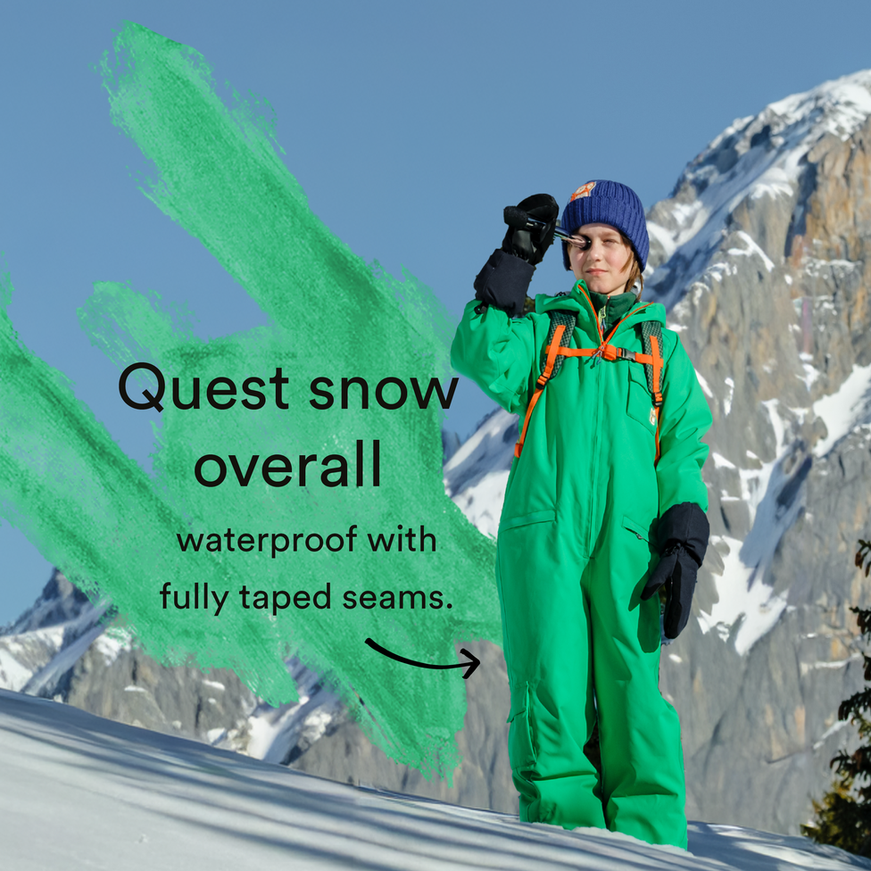 Waterproof, with a water column of 15,000 mm and completely sealed seams, our Quest ski suit provides the ultimate protection from wet and snow. The 100% PFC-free, water-repellent DWR finish is environmentally friendly, and the reflective details ensure improved visibility at dusk. The Lycra cuffs with thumb holes guarantee a comfortable fit and additional warmth. With breathability of 10,000 gr/m2/24h and a windproof design, your child will stay dry and comfortable. Our ski suits also stand out thanks to high abrasion resistance and a chin guard. Enjoy carefree adventures in the snow with our Quest ski suit for kids.Stylish outfits for winter adventures