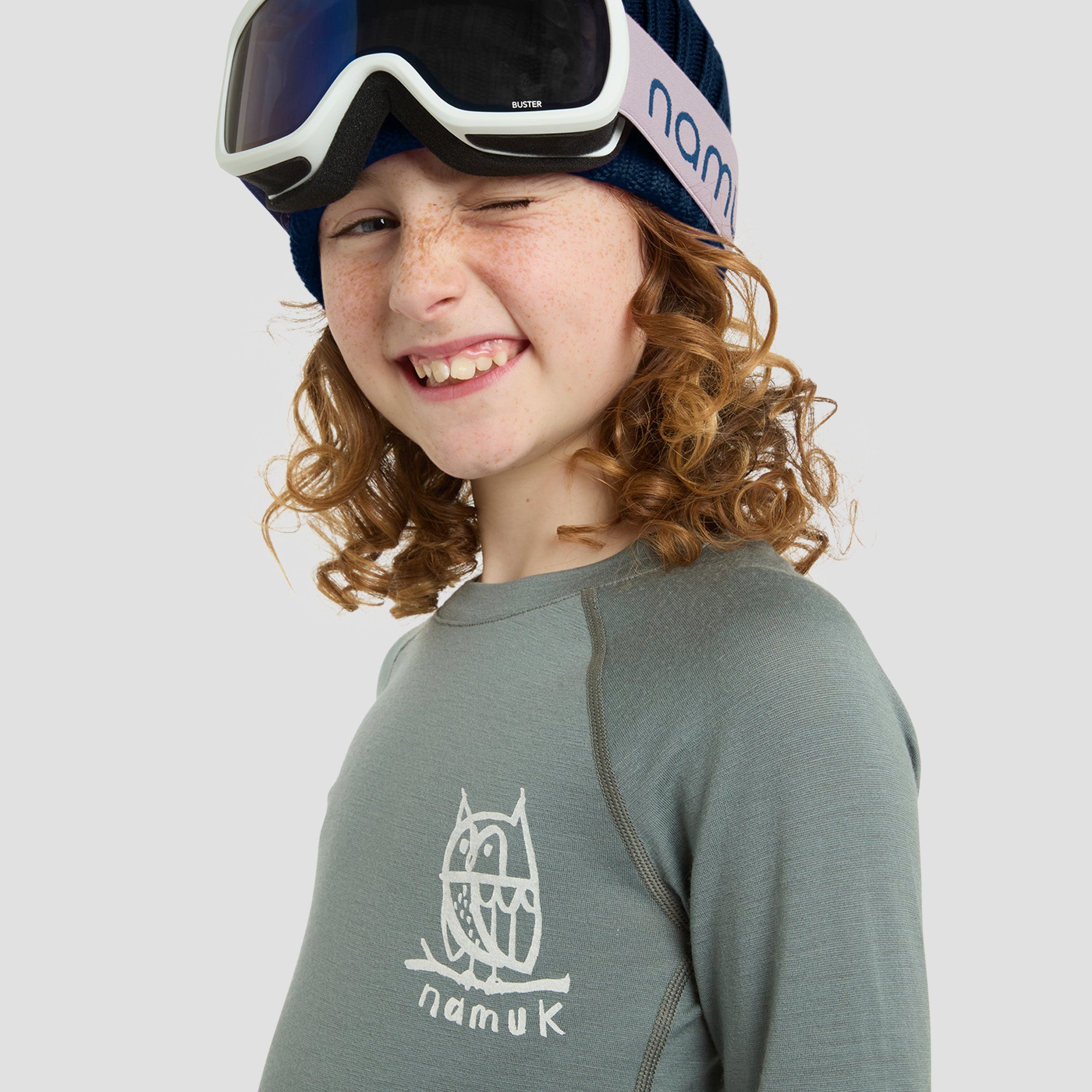 The long-sleeved shirt can easily be worn as a base layer under our winter jackets and pants, or as is for lazing around at home. And, because of Merino’s temperature-regulating effect, the longsleeve has been known to replace the old favorite pajamas for a lot of kids.